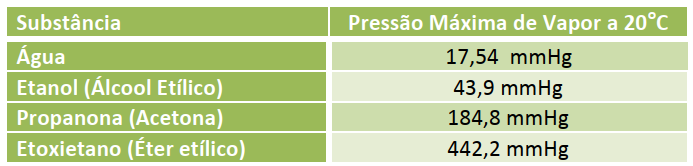 A tabela abaixo mostra as pressões máximas de vapor de diferentes substâncias a uma mesma temperatura.